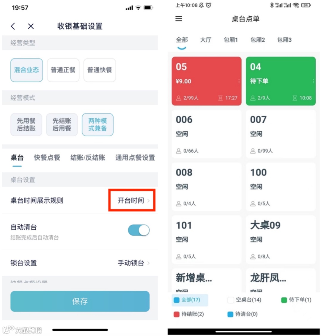 在智掌柜商户端,桌台时间展示规则可设置为开台时长和开台时间(默认为开台时长)