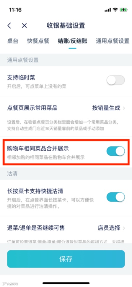 可以设置购物车相同菜品合并展示,默认是开启合并展示。当开启合并展示后,购物车点餐时相邻加购的相同菜品合并展示;不相邻加购的相同菜品也会合并展示。当开关关闭后,只有相邻的相同菜品合并展示,不相邻的则不合并展示。