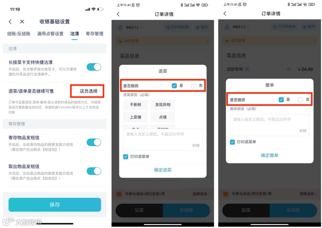 在智掌柜商户端,退菜/退单是否继续可售设置,默认为全部可继续销售,可选择全部自动报损和由店员选择是否报损。