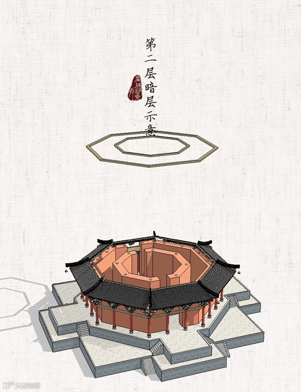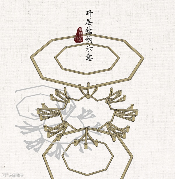 暗层之上再铺设梁、柱、枋以及斗栱是为明层。暗层明层结合
