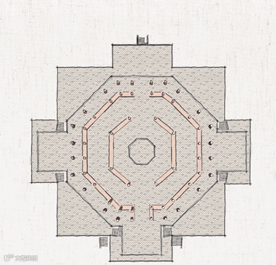 塔基的地上部分,分为上下两层上层为八边形、下层为正方形,对应“天圆地方”。四面再各伸出月台,形成一个稳定的大十字结构