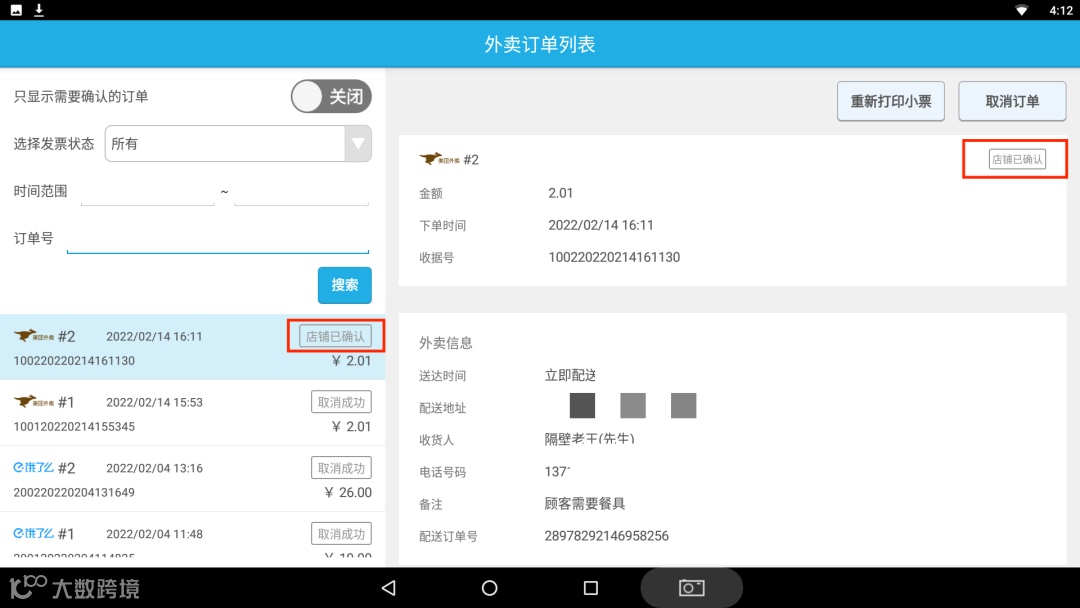 当美团外卖订单处于“配送准备中”以及“配送中”状态时,收银机后台只显示为“店铺已确认”状态。