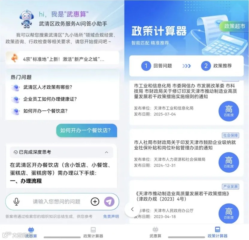 拓展智治服务边界,落地连云港、南通、天津武清等多个城市级项目。其中,“武惠算”AI政策计算器,依托双核心大模型,为企业提供政策推送、合规经营等智能服务,实现从“企业找政策”到“政策找企业”的转变,打造24小时在线的“一站式”AI惠企服务平台。