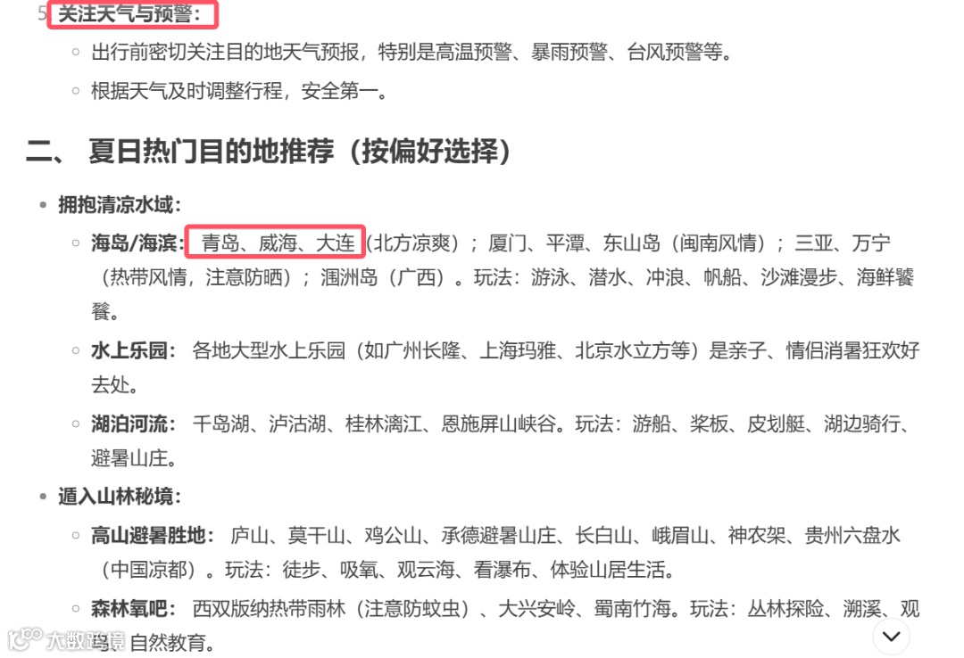 当你想要的是旅游地点的攻略,输入前者更偏向于向你描述旅游的大规划,而后者精心设计的提示词,能够让模型更准确地理解你需要旅游地点攻略的意图,从而输出更符合你需求的内容。