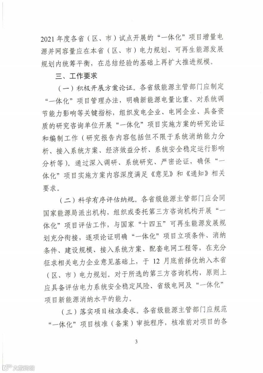 各省级能源主管部门应开展“一体化”项目评估工作,与国家“十四五”可再生能源发展规划充分衔接,逐项论证明确“一体化”项目立项条件、消纳 条件、建设规模、接入系统方案、配套电网工程等,在充分 征求相关电力企业意见基础上,于 12 月底前择优纳入本省(区、市)电力规划。