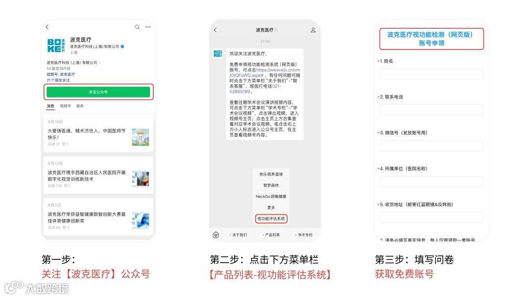 关注”波克医疗“公众号,点击下方菜单栏”产品列表“-”视功能评估系统“,即可在填写问卷获取免费账号,可永久免费使用视功能评估系统网页版。