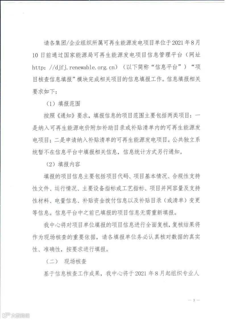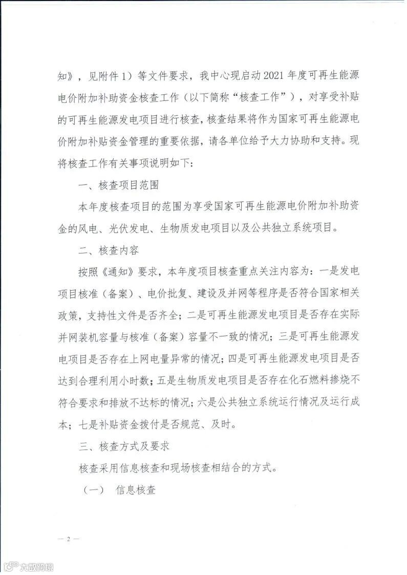 另据国家可再生能源信息管理中心发布的《关于请协助开展2021年度可再生能源电价附加补助资金核查工作的函》,核查采用信息核查和现场核查相结合的方式,基于信息核查工作成果,该中心将于2021年8月起组织专业人员分组开展项目现场核查工作。