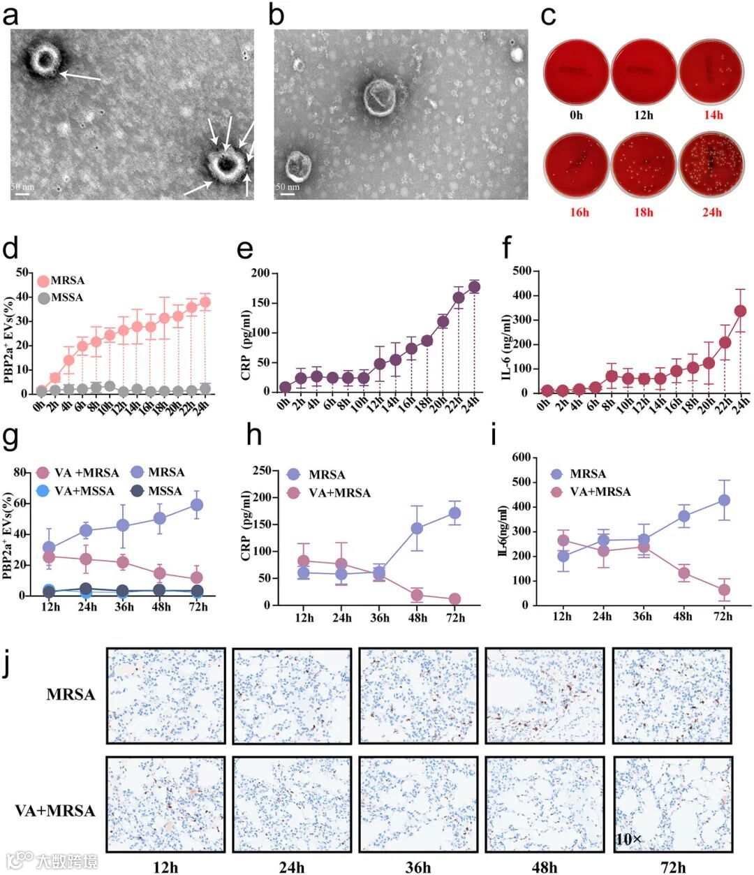 在小鼠肺炎模型中,经万古霉素治疗后,血浆中 PBP2a+ EVs 的比例逐渐降低,而非治疗组则随时间增加。图 4 同样展示了这一变化过程,提示 PBP2a+ EVs 有潜力作为评估 MRSA 感染治疗效果的指标。