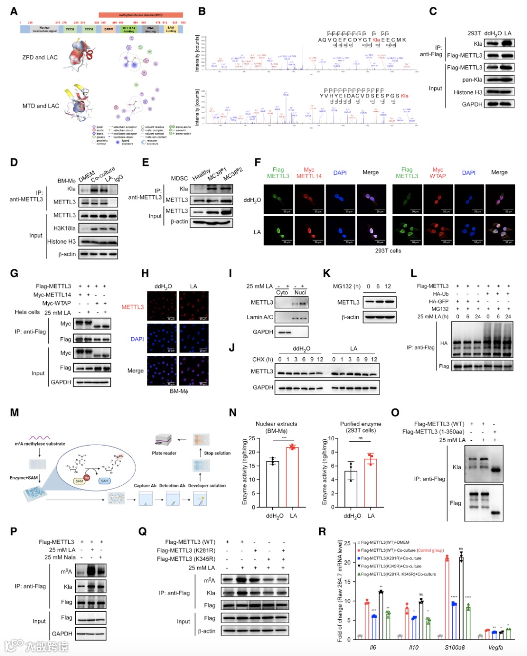 作者利用分子操作环境下的分子对接来预测L-乳酸分子与METTL3的甲基转移酶结构域或锌指结构域之间的结合亲和力。可以被乳酸化的几个氨基酸位点如图7A。液相色谱-质谱(LC-MS)鉴定了METTL3的修饰位点,包括K281和K345(图7B)。Kla确实存在于METTL3上(图7C)。在与MC38肿瘤细胞共培养24小时(图7D)和肿瘤浸润的髓源性抑制细胞(图7E)后,髓源性巨噬细胞中也可以检测到METTL3的乳酸化。