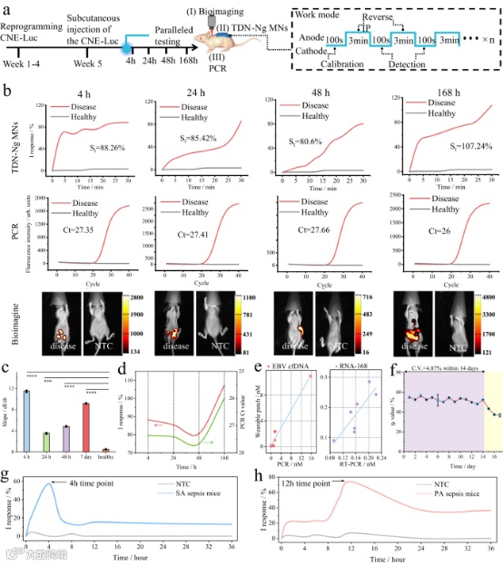 接下来,进一步验证了TDN-Ng MNs在体内对核酸的实时监测。结果发现,TDN-MN装置在体内靶向核酸灵敏检测中具有长期稳定性,且能够实时监测脓毒症动物模型炎性细胞因子。