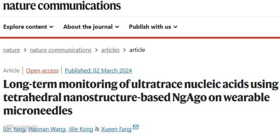 针对以上问题,复旦大学化学系与生物医学研究所两位教授于2024年3月2日在Nature Communication上发表题为Long-term monitoring of ultratrace nucleic acids using tetrahedral nanostructure-based NgAgo on wearable microneedles 的研究性论文。团队报道了一种基于四面体纳米结构的格雷戈里钠杆菌 Argonaute (NgAgo),用于长期稳定监测体内超痕量未扩增核酸(游离 DNA 和 RNA)在可穿戴设备上的败血症。这种集成的无线可穿戴设备由柔性电路板、微针生物传感器和具有富集能力的可拉伸表皮贴片组成。