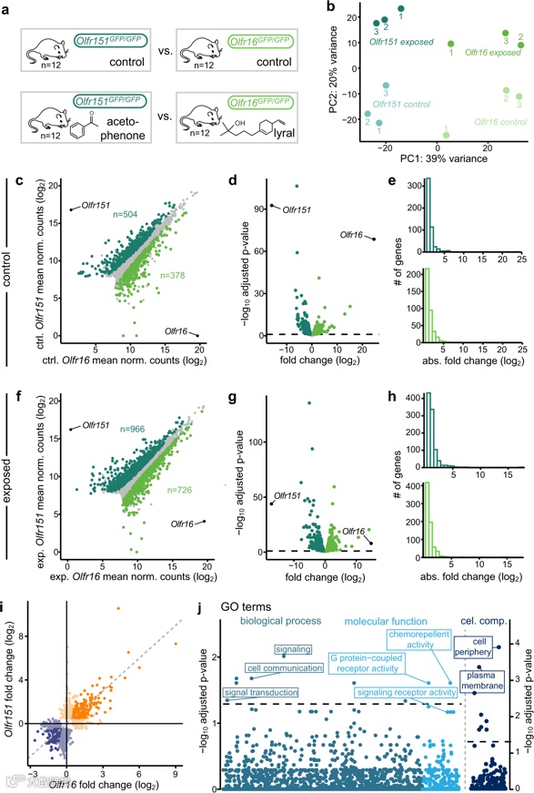 作者确定了在暴露于气味后神经元群体的转录组。作者使用了两个敲入小鼠品系,Olfr151GFP/GFP和Olfr16GFP/GFP,当转录时,绿色荧光团表达。这些嗅觉受体有不同的序列,在嗅觉上皮的不同亚区表达,并对不同的激动剂作出反应。作者将12只活的和自由运动的小鼠暴露于苯乙酮和里拉醛5小时,用流式细胞仪分离荧光表达Olfr151-和Olfr16的神经元,并对其转录组进行测定和分析。