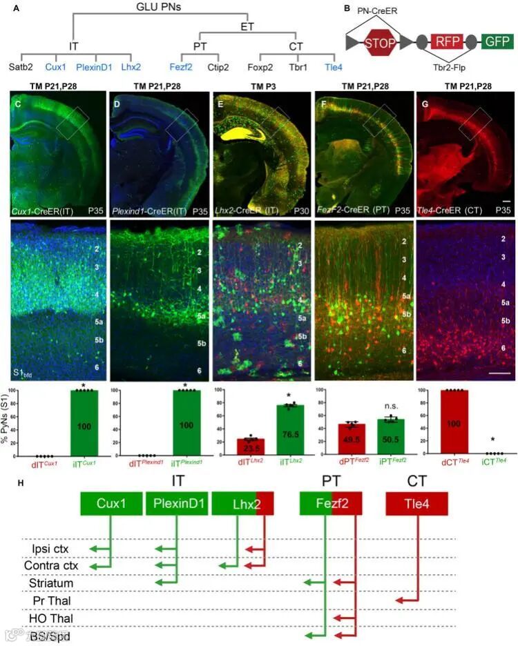 Tle4-CreER驱动捕获了CT PNs的一个子集,而产后诱导的Tle4-CreER IS标记显示,所有的PNsTle4都是由dNG生成的,dNG和iNG在每个主要类别中产生不同的PNs亚群,投射到不同的皮层和皮层下区域。