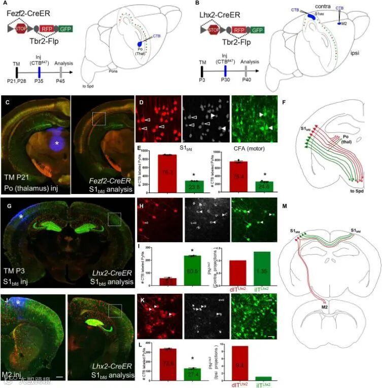 与在CTB-和RFP-或GFP双标记的PNs中,在S1bfd躯体感觉和尾前肢区(CFA)运动皮层投射到高阶丘脑核(后Po核)的dPNsFezf2 (RFP)比iPNsFezf2 (GFP)多3倍。