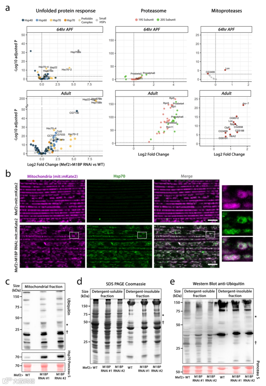 作者检测到M1BP 敲除导致一半的UPR(未折叠蛋白质应答)相关基因、所有蛋白酶体相关基因以及所有有丝分裂蛋白酶编码基因显著上调(图6a)。有趣的是,当线粒体内含物开始出现时,能够在蛹中期检测到这些基因表达的变化(图6a)。这些数据表明,M1BP 敲除引发了蛋白质质量控制途径的转录激活。利用mit::mKate2(一种近远红色报告线)标记固定组织中的线粒体,Hsp(热休克蛋白)70应激反应主要定位于线粒体(图6b),线粒体特异性Hsp22转录增加300多倍,表明M1BP 敲除主要导致线粒体内UPR。使用抗Hsp70抗体对飞行肌线粒体纯化蛋白进行免疫印迹分析也证实了线粒体内UPR(图6c)。与在线粒体片段中观察到的相似,不溶性蛋白片段也显示出泛素化蛋白增加(图6e)。这些数据表明,M1BP功能的丧失导致线粒体蛋白质毒性应激的广泛存在,导致线粒体基质中不溶性蛋白质聚集体的积累。
