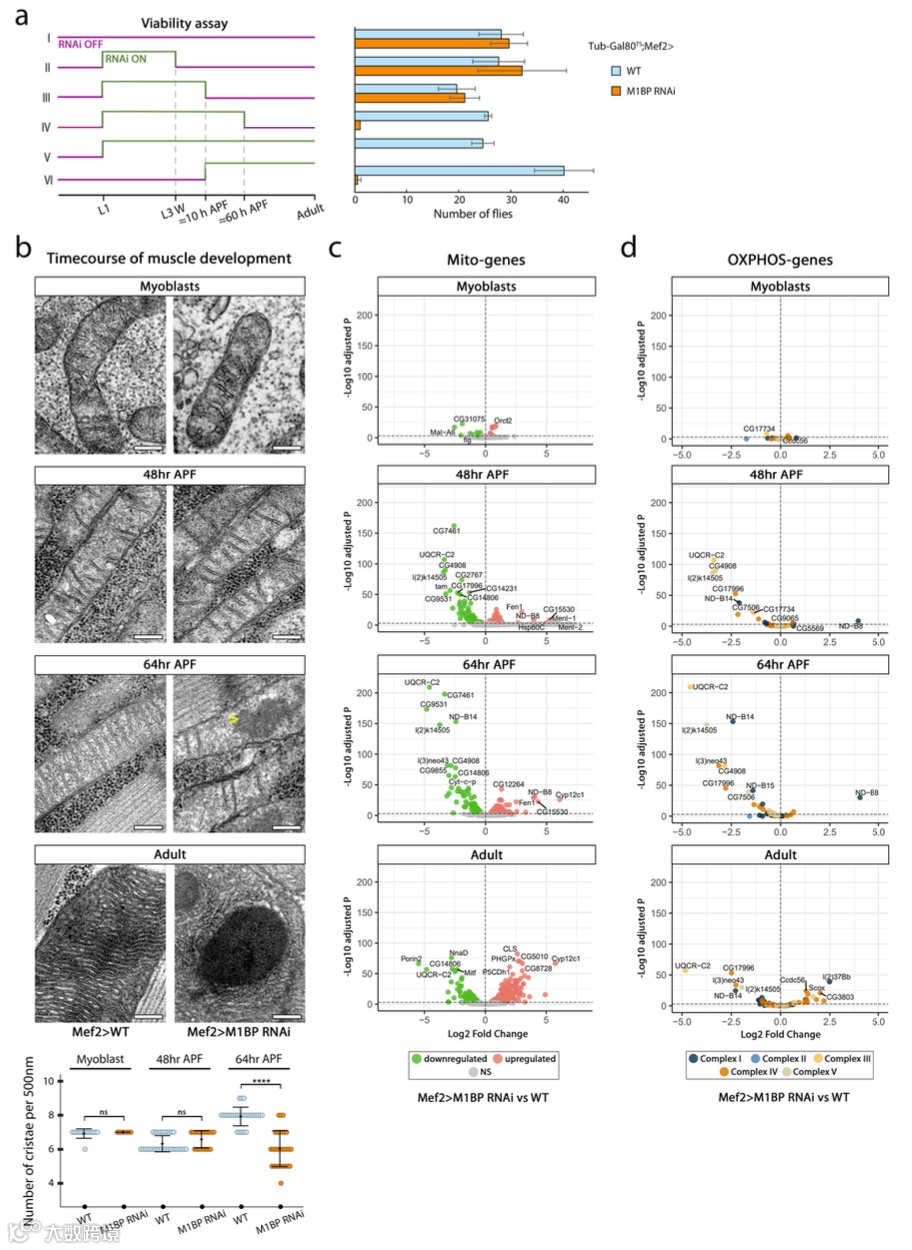 作者发现,在APF≈10-60 h期间下调M1BP会导致蛹致死表型(图3a),这与参与线粒体能量代谢的成分转录增加的阶段相吻合。作者未发现成肌细胞线粒体有任何重大形态学变化(图3b)。相比之下,在APF 64小时, M1BP缺失肌肉中的线粒体显示出更少的嵴,并且在其基质中含有小的电子密度,无晶态内含物,该结果与在成人M1BP 敲除线粒体中观察到的相似(图3b)。在蛹期和成虫期,与 OXPHOS相关的基因表达量下调最多,因此作者使用整理的OXPHOS编码基因的更新列表单独分析与OXPHOS相关的基因(图3d)。作者观察到,特异性敲除肌肉M1BP使OXPHOS编码基因的数量呈时间依赖性增加,而在成肌细胞阶段只有两个OXPHOS基因差异表达,在48小时增加到15个基因,在64小时增加到40个基因,在成年阶段增加到35个基因,几乎所有这些基因都下调。这些数据表明,在核编码OXPHOS基因转录上调的关键时期,M1BP是其表达所必需的。