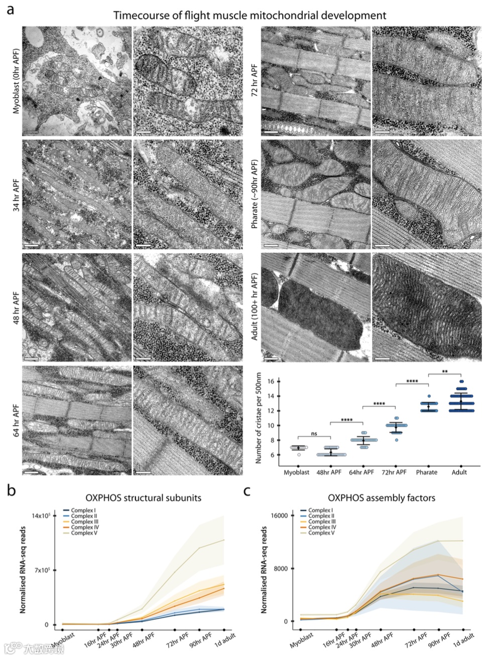 图2 在飞行肌发育过程中,发生了大规模的OXPHOS相关基因转录上调和线粒体嵴生物发生