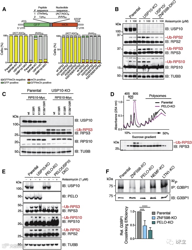 为了评估G3BP1-Family-USP10复合体在感知异常mRNA方面的潜在作用,作者构建了稳定表达GFP绿色荧光和mCherry红色荧光报告融合蛋白的细胞系,融合蛋白由12个赖氨酸(AAA)密码子组成的间隔区分离,可诱导核糖体翻译停顿,或者6个苏氨酸-丝氨酸(ACTAGC)密码子作为对照通过流式细胞术检测荧光信号。在ZNF598-KO细胞中融合蛋白的表达不受间隔序列的影响,因为这些细胞不能感知异常的mRNA(图5A)。相反,在亲本细胞中过表达c末端具有myc标记的野生型,K214R, K227R, K230R,或K227R/K230R突变型RPS3蛋白,报告蛋白的表达没有改变,碰撞感知及核糖体相关质量控制不受RPS3单泛素化影响(图5A)。随后作者证实在亲本细胞中,低剂量的茴芹霉素处理比高剂量处理诱导更强的RPS10单泛素化(图5B)。在USP10-KO细胞中,敲除ZNF598抑制了RPS10的单泛素化,但仍残留一些PS2和RPS3单泛素化,对茴香霉素处理不敏感(图5B)。 同样,USP10敲低细胞中过表达myc标记的K138R-RPS10也降低了RPS2和RPS3单泛素化水平(图5C)。与亲本细胞相比,PELO敲低细胞表现出强烈的80S核糖体积累,也显示单泛素化RPS3的富集(图5D)。USP10敲低和USP10-PELO敲低的细胞RPS3泛素化水平更高(图5E)。在敲低ZNF598和PELO的情况下,G3BP1的RNA交联强度显著降低(图5F)。