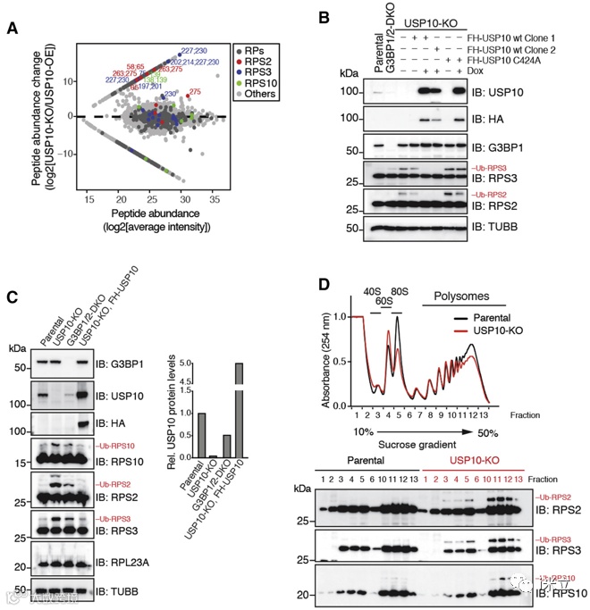 为了鉴定G3BP1-Family-USP10复合体的蛋白靶点,作者进行了泛素蛋白质组学分析,如图在USP10敲低细胞中富集到了泛素化程度最高的RPS2、RPS3和RPS10(图3A),并且进一步通过免疫印迹实验验证组学结果,FH-USP10的表达逆转了RPS2、RPS3和RPS10的单泛素化(图3B-C)。G3BP1/2敲低也引起单泛素化RNA结合蛋白(RPs)的积累,UPS10免疫印迹结果表明在G3BP1/2双敲低作用下,USP10蛋白水平显著降低,表明USP10异二聚体具有稳定G3BP1蛋白的功能(图3C)。与亲本细胞相比,单泛素化的RPs在USP10敲低细胞的核糖体40S、80S亚基和多核糖体内显著富集(图3D)。