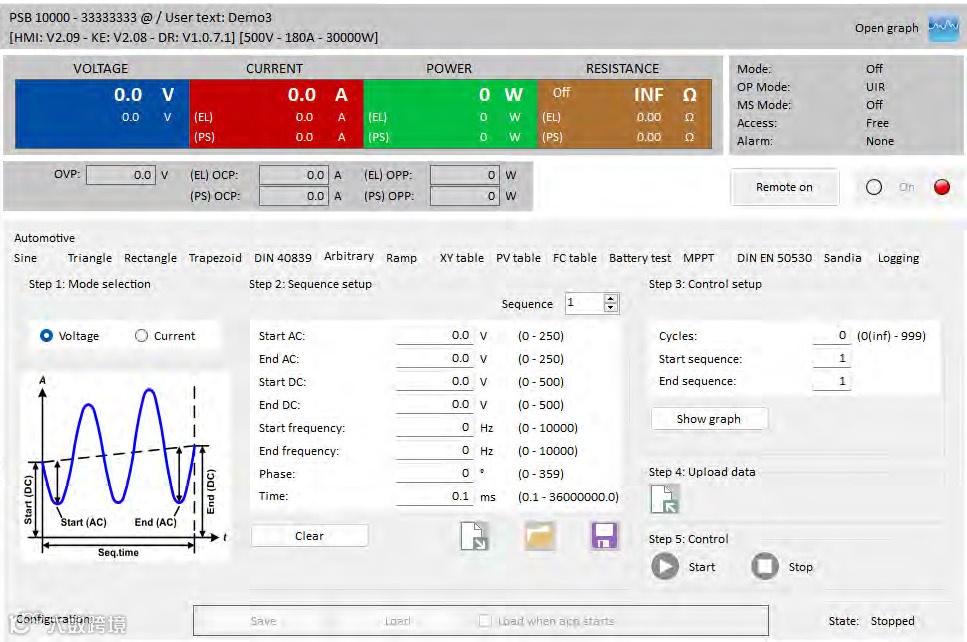 图2. EA仪器能够生成的波形。右上图举例显示了标准和自定义波形。波形左侧的PC显示屏举例显示了在使用EA Power Control软件创建波形时所用的参数。