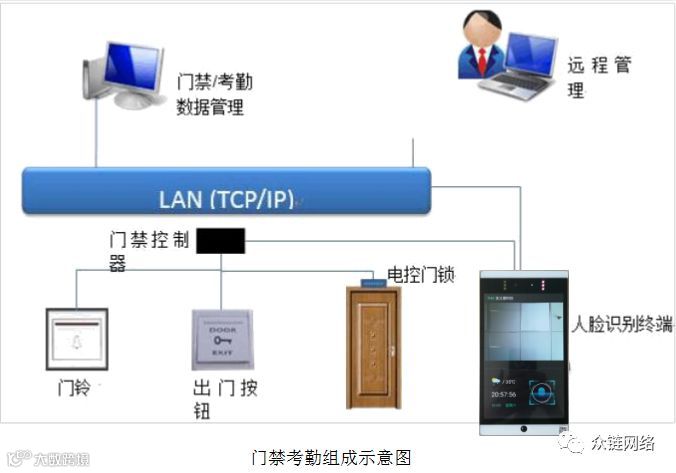 该系统由硬件设备(人脸识别终端、门禁控制器、门铃、电锁等),控制管理软件(人脸识别实时监控、人脸识别门禁考勤管理系统)组成。