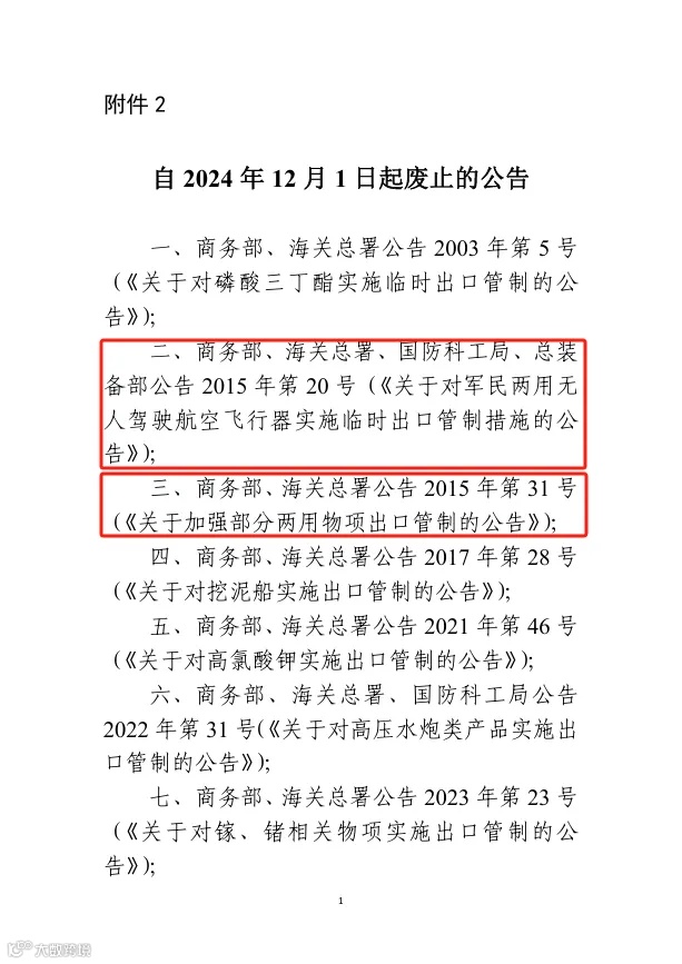 以下为自2024年12月1日起废止的相关无人机出口管制措施