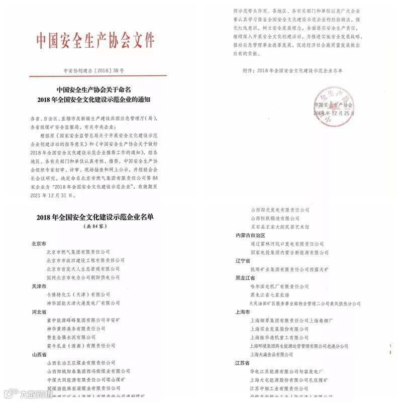 此次评选活动,分别经内蒙古自治区、国家安监局、行业协会组织的专家组结合安全文化示范单位建设考评标准,采取现场检查、查阅资料、随机提问和听取汇报的方式进行了全面检查评审。评审组充分肯定了公司在安全文化示范单位创建工作中的成绩,认为安全管理制度完善、培训教育到位、全员参与明显,安全宣传阵地建设富有特色,安全文化环境氛围浓厚,符合国家级安全文化建设示范企业评定标准。