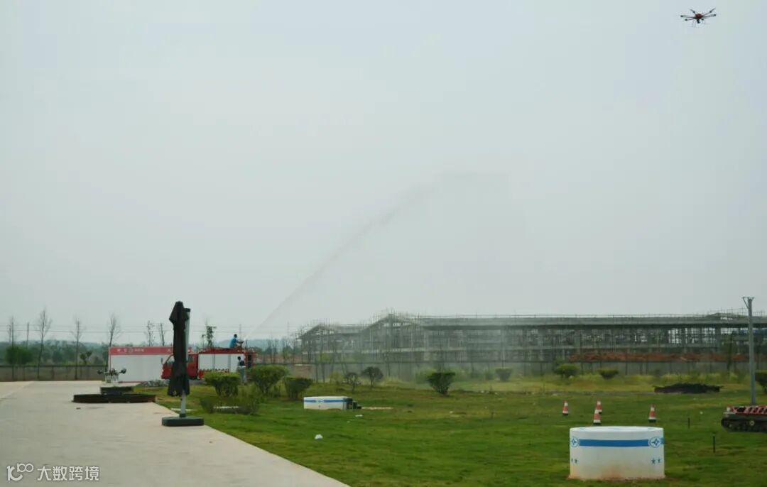 无人机试飞场上,消防无人机从指挥车后舱起飞,抛下水管,等待连接后灭火