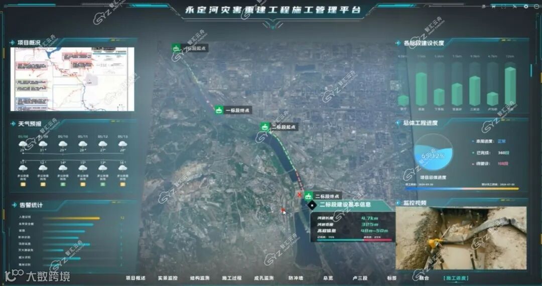 为满足永定河灾后重建项目施工过程质量监督管理要求,建设视频孪生全景一张图平台。通过在工程现场部署摄像机,实现防冲墙施工范围的全天候视频监控覆盖,并综合运用三维地理信息、视频拼接融合、数字孪生等先进技术,以3D GIS为核心,融合施工现场监控视频等数据,打造永定河灾后重建工程视频孪生全景一张图平台,分别从监测、监控和管理的角度,辅助相关单位对施工质量、施工安全、施工进度、施工工艺、施工规范、施工调度等进行便捷、精准地可视化监督管理,提高管理效率,节省施工成本。