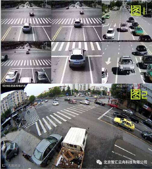 传统视频监控十字路口点位布置通常要使用4-6个摄像机进行监控,监控画面反应到中控室画面如(图1),多个监控画面对还原路口真实情况和事故研判存在很大困难。而使用全景摄像机如(图2),出现了整体图像变形边缘模糊的现象,而全景摄像机价格成本又较高,仍无法解决还原真实场景、研判事故纠纷等实际问题。