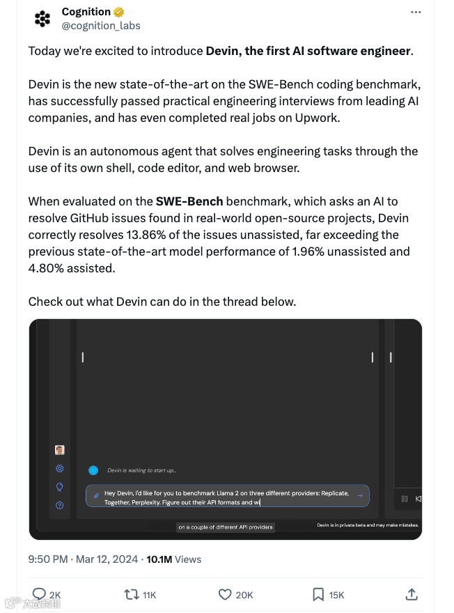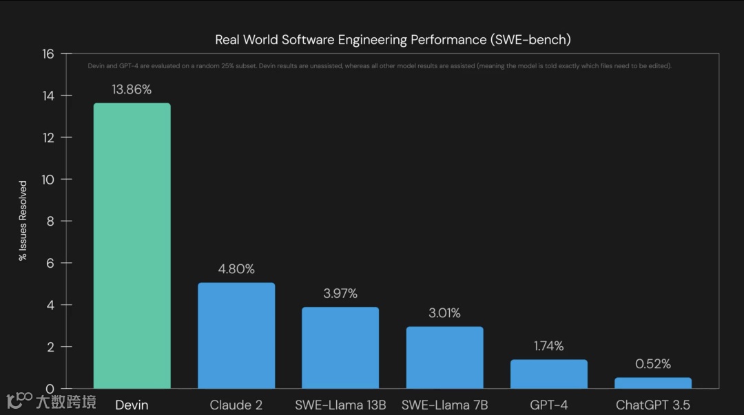 在SWE-Bench基准测试中,Devin以13.86%的成功率碾压了当前最先进的AI模型。