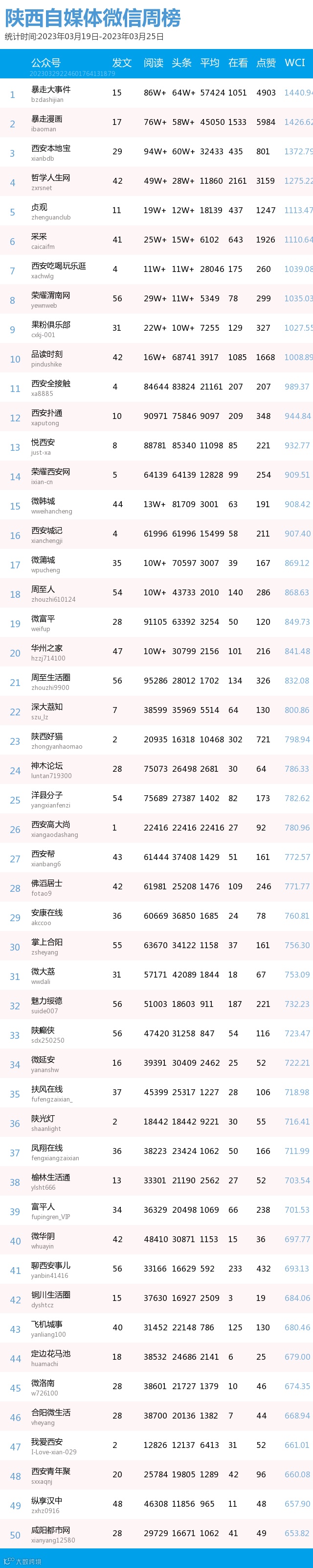 最新陕西自媒体微信公众号50强重磅出炉!TOP50上周共计发文1457篇,贡献阅读总量650万+,在看总量1万+,阅读总量较上周有所下降,希望下期各大平台加油哟~(查看榜单可直接下滑)