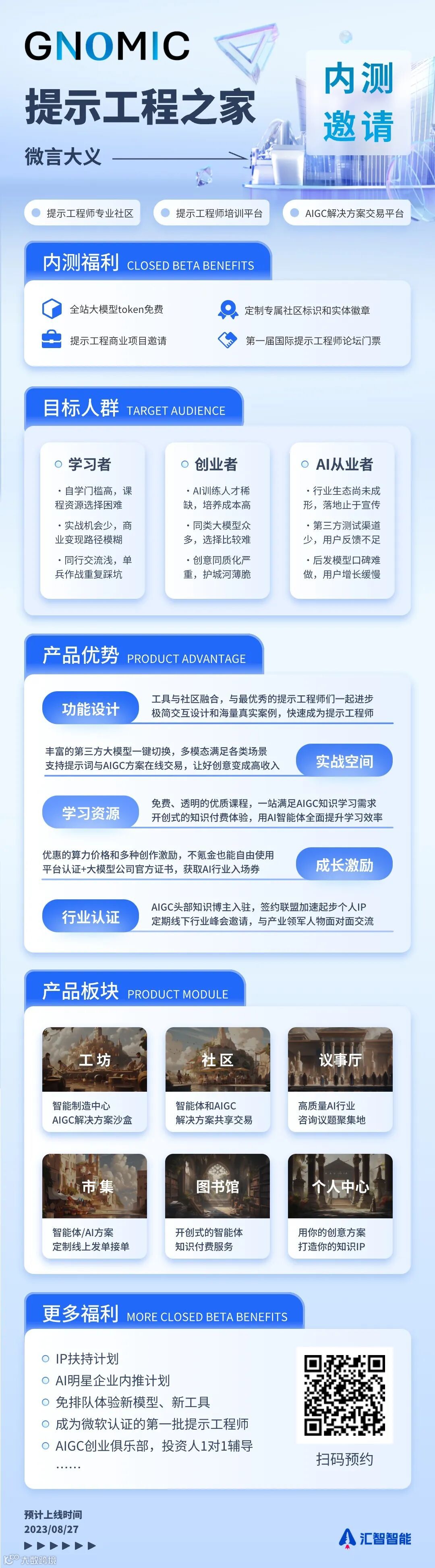 “微⾔⼤义”提示⼯程师之家作为提示词社区和提示工程师训练工具平台,旨在帮助广大用户深入了解大模型应用价值,提升智能体和AIGC工具运用能力。刘黄骁烈表示,微言大义代表了汇智智能在探索大模型商业化道路上,关注用户体验、构建社区生态、解决实际问题的初步实践。也希望这种以用户为中心的思路,能为整个行业进一步开拓大模型的应用价值提供一些启发。