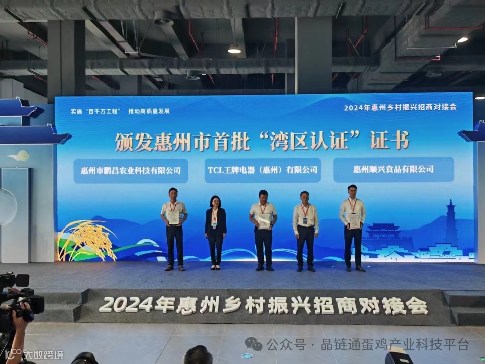 5月16日上午,在2024惠州市乡村振兴招商对接会上,广东省市场监督管理局副局长高国盛、惠州市政府副市长李俊玲颁发“湾区认证”首张鸡蛋证书给予鹏昌农业董事长董福建。据悉,“湾区认证”是在市场监管总局和粤港澳有关部门指导下,三地认证机构等经营主体,基于粤港澳大湾区共通执行标准,以粤港澳大湾区认证联盟形式开展的高端品质自愿性认证,相关技术指标满足三地市场准入要求,具体项目由三地共同组织实施,实现“一次认证,三地通行”。