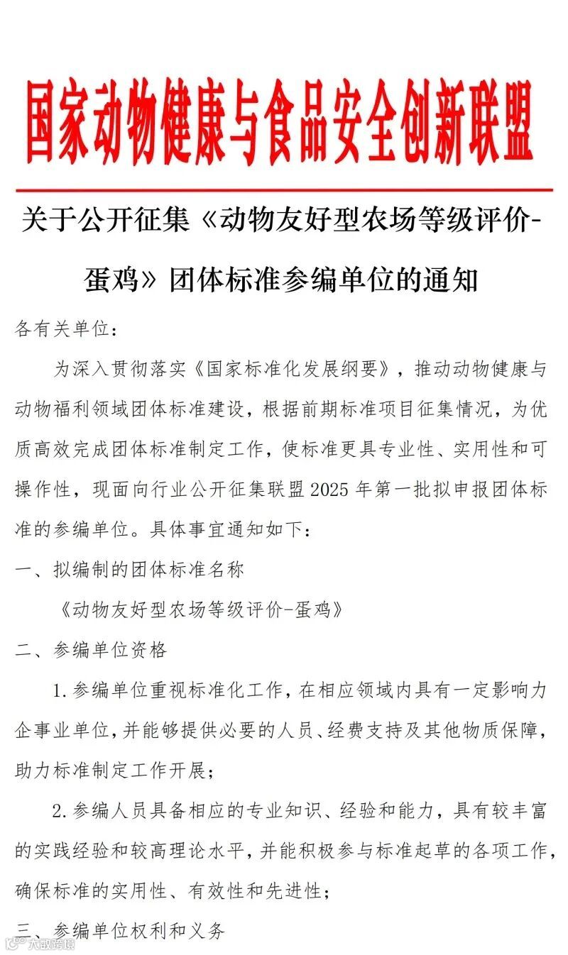 国家动物健康与食品安全创新联盟发布关于公开征集《动物友好型农场等级评价-蛋鸡》团体标准参编单位的通知。