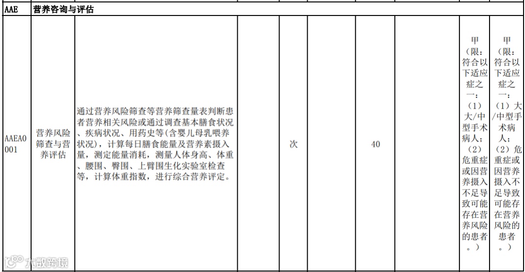 此次调整将“营养风险筛查与营养评估”纳入本市基本医疗保险和工伤保险支付范围,属于甲类医保,涉及本市公立医疗机构、非营利性医疗机构、医保定点医疗机构。这将大幅提高大/中型手术病人和危重症患者的营养筛查率,促进患者在住院期间得到有效的营养治疗。