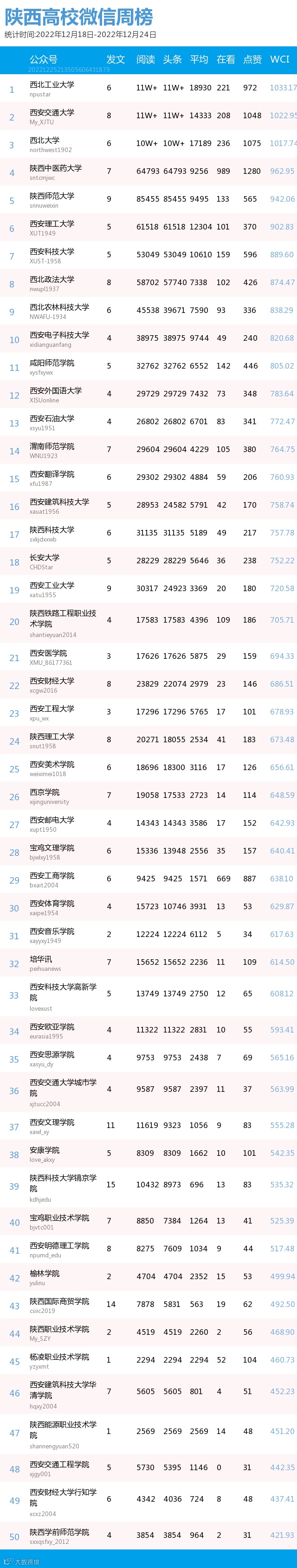 最新陕西高校微信公众号50强重磅出炉!TOP50上周共计发288篇,贡献阅读总量134W+,在看总量4110,阅读数据较上周有所上升,希望各大平台下期继续加油哦~(查看榜单可直接下滑)