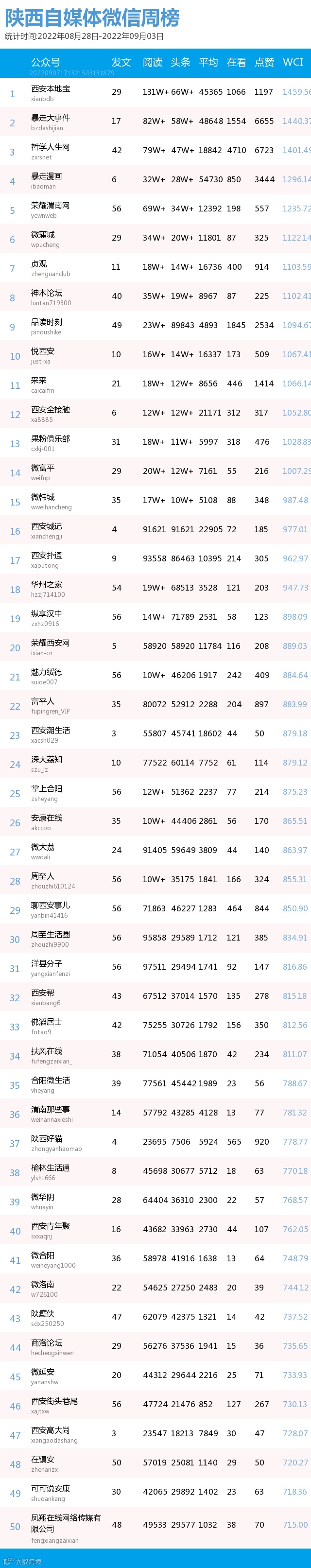 最新陕西自媒体微信公众号50强重磅出炉!TOP50上周共计发文1555篇,贡献阅读总量863万+,在看总量1万+,阅读总量较上周有所下降,希望下期各大平台加油哟~(查看榜单可直接下滑)