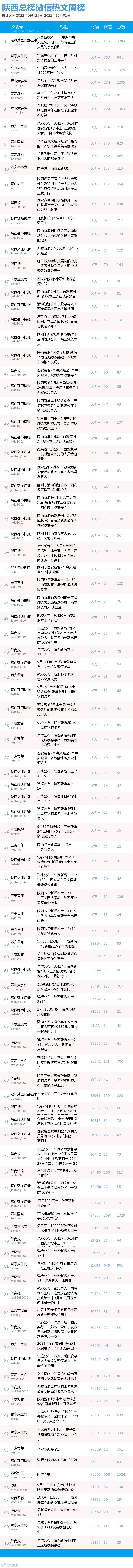 最新陕西总榜微信公众号100强重磅出炉!TOP100上周共计发2864篇,贡献阅读总量2658W+,在看总量3W+,阅读数据较上周有所上升,希望各大平台下期继续加油哦~(查看榜单可直接下滑)