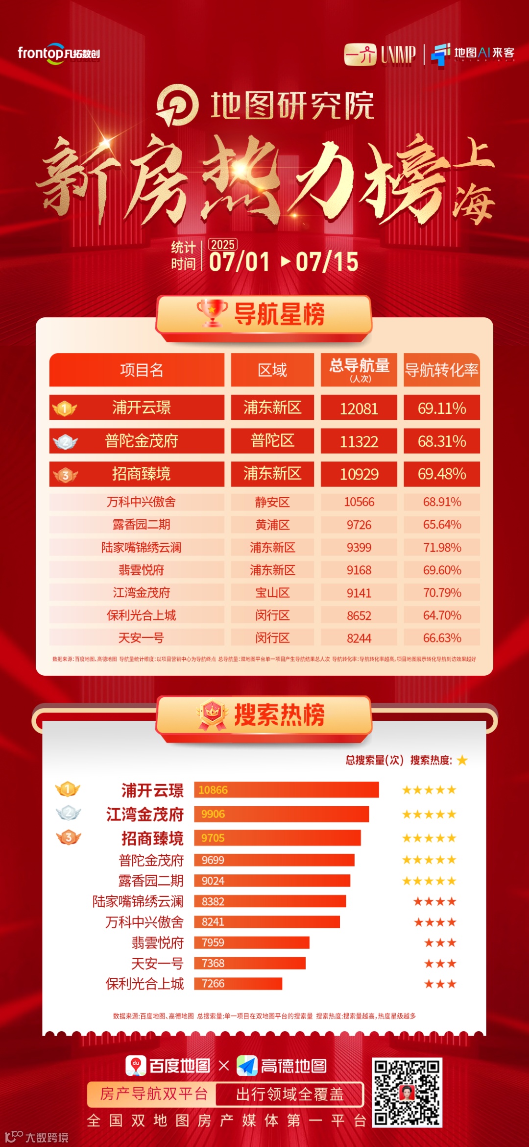 目前,地图研究院针对全国一二线代表城市,通过监控7月上半月重点城市主流新盘、热盘双地图平台导航量、搜索量等数据信息,独家发布《重点城市双地图新房热力榜》(以下称“《榜单》”)