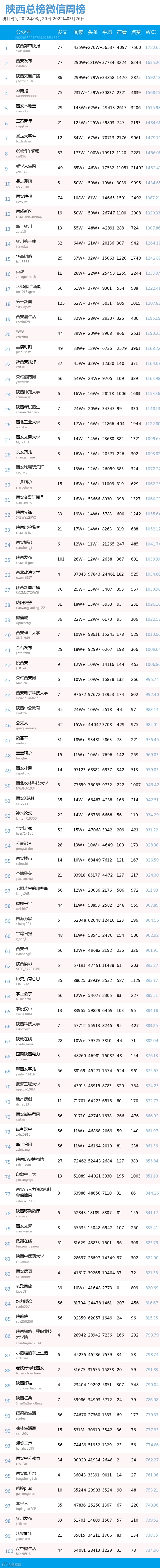 最新陕西总榜微信公众号100强重磅出炉!TOP100上周共计发文3047篇,贡献阅读总量3388万+,在看总量5万+,阅读总量较上周有所下降,希望下期各大平台加油哟~(查看榜单可直接下滑)