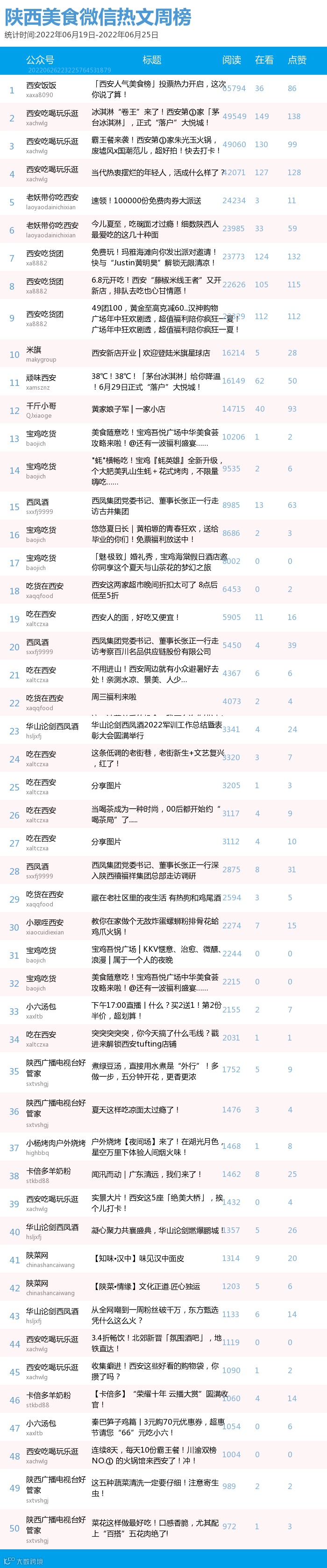 最新陕西美食类微信公众号50强重磅出炉!TOP50上周共计发文220篇,阅读总量达到52万+,在看总量达到1157。阅读总量较上周有所上升,希望下期各大平台再接再厉!(查看榜单可直接下滑)