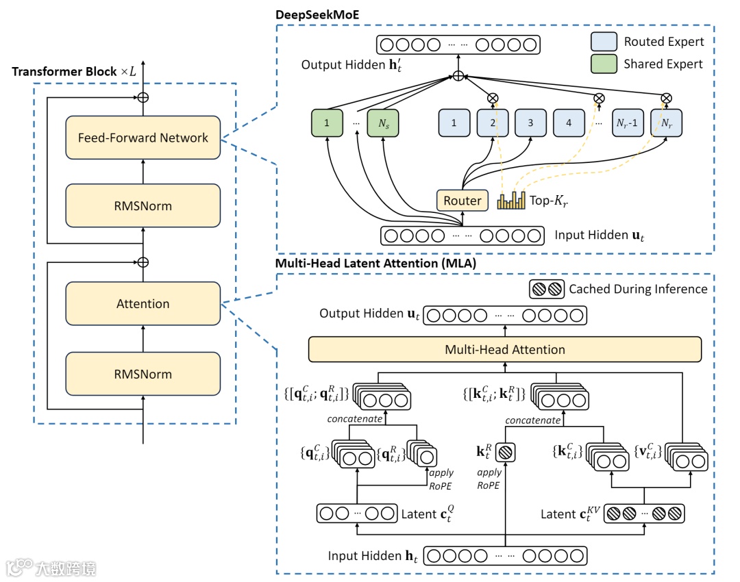 DeepSeek-V3延续Transformer架构,引入多头潜在注意力(MLA)和DeepSeekMoE架构,实现高效推理与经济训练。MLA对注意力的键值(KV)和查询(Q)进行低秩压缩,大幅降低推理缓存和训练激活内存,同时保持与标准多头注意力相当的性能。