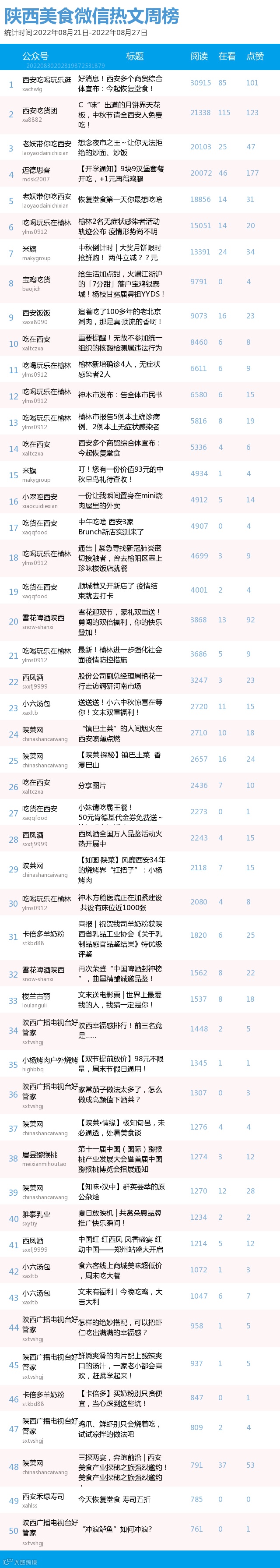 最新陕西美食类微信公众号50强重磅出炉!TOP50上周共计发文181篇,阅读总量达到27万+,在看总量达到612。阅读总量较上周有所下降,希望下期各大平台再接再厉!(查看榜单可直接下滑)