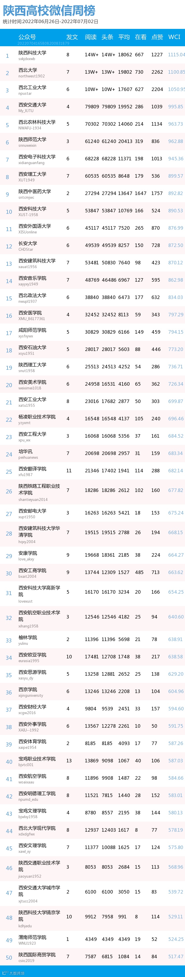 最新陕西高校微信公众号50强重磅出炉!TOP50上周共计发293篇,贡献阅读总量157+,在看总量7697,阅读数据较上周有所下降,希望各大平台下期继续加油哦~(查看榜单可直接下滑)