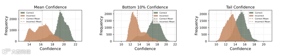 Fig.1不同指标下,正确与错误推理轨迹的置信度分布