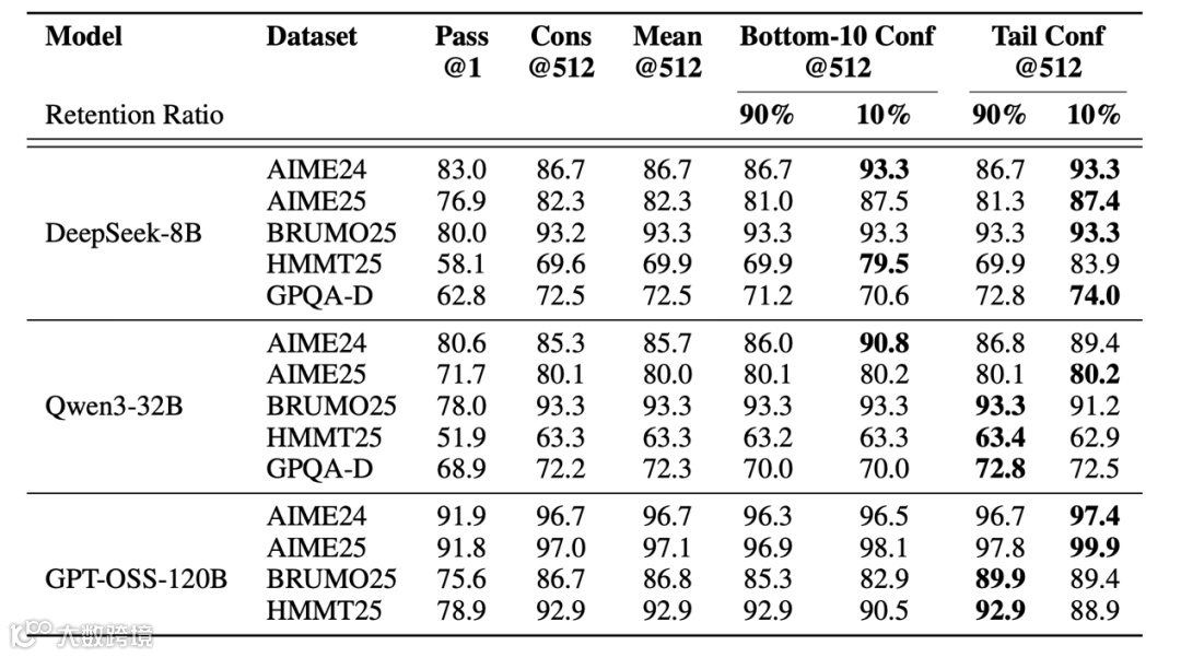 DeepSeek-8B在AIME24, AIME25, BRUMO25以及 HMMT25上的实验结果验证了设计思路:利用最不自信的片段来筛选推理轨迹,可以提供一种强有力的局部信号用于提前终止;同时,结合自适应共识停止机制,能够在不牺牲准确率的情况下进一步压缩生成的 token 数量。