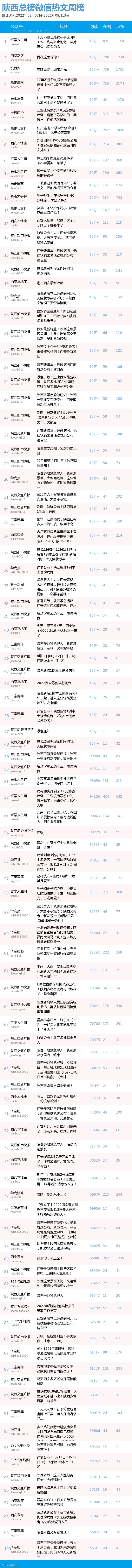 其中“陕西都市快报”共发文69篇,阅读量达到了295万+,在看人数为2778,WCI为1633.72;“陕西交通广播”共发文84篇,阅读量达到了230万+,在看人数为996,WCI为1529.38;“华商报”本周发文72篇,阅读量为172万+,在看人数为1802,WCI为1502.13。