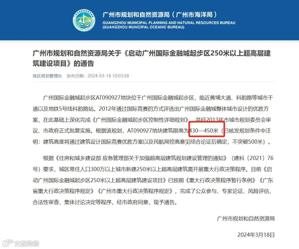 公告内容提到,起步区内的AT090927地块建筑限高为430—450米。