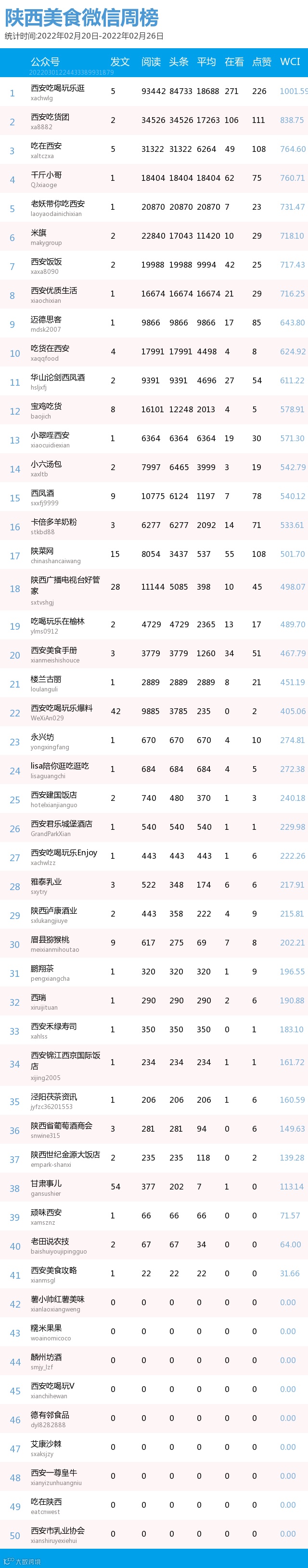 最新陕西美食类微信公众号50强重磅出炉!TOP50上周共计发文228篇,阅读总量达到39万+,在看总量达到817。阅读总量较上周有所上升,希望下期各大平台再接再厉!(查看榜单可直接下滑)